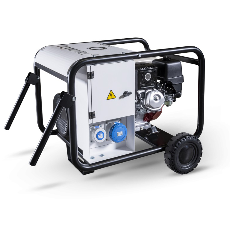 Grupo electrógeno monofásico con ruedas para facilitar su transporte. Ideal para pequeños trabajos auxiliares (3 kW) y trabajos auxiliares más exigentes en obra con taladros, martillos, bombas de agua, tronzadoras, etc...