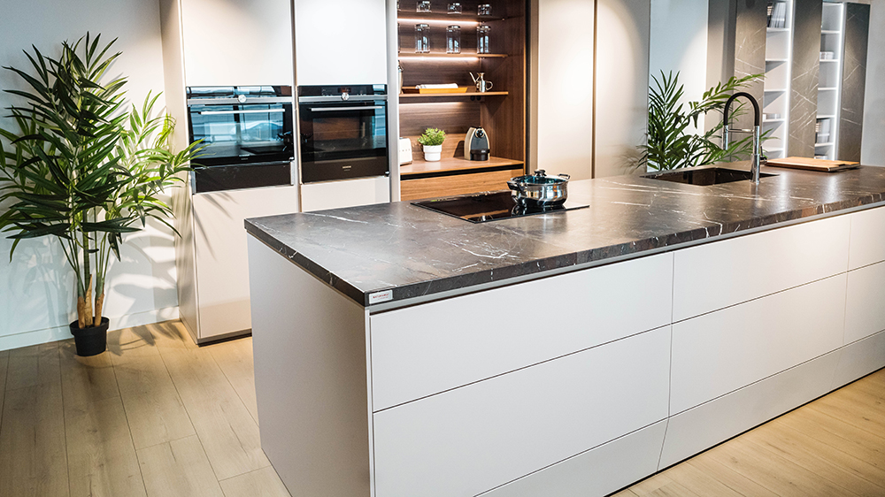 Los muebles de cocina SANTOS se agrupan en columna, buscando el suelo y el techo de la estancia, se mimetizan con la pared. Los armarios de la zona inferior, ya sea en formato isla o a pared, al salir directamente del suelo pueden adoptar una forma escultórica, haciendo olvidar su naturaleza de mueble contenedor.