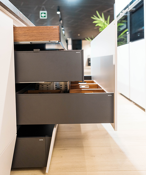 Por ello podemos encontrar en cocinas SANTOS, cajones zócalo de gran capacidad, pudiendo llegar hasta a 4 niveles de altura, trabajando con diferentes módulos, gavetas de diferentes alturas, cajones, armarios columna que integran almacenaje e incluso electrodomésticos... Todo ello diseñado para una mayor funcionalidad del usuario.