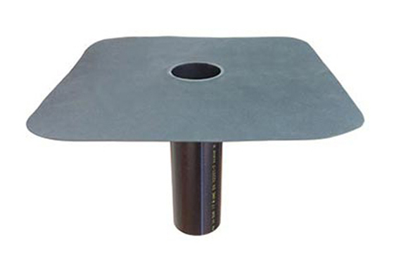 Elemento prefabricado en cuatro diámetros (75, 90, 110 y 125 mm) con tubo de polietileno de alta densidad termofusionado a un faldón de lámina Giscolene EPDM de 36x36 cm utilizado para rematar los desagües.