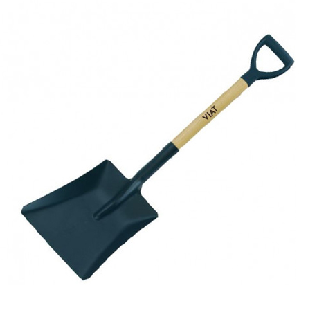Pala cuadrada de chapa de acero, unión reforzada con remache, mango de madera con anilla plástica. Para cavar y recoger